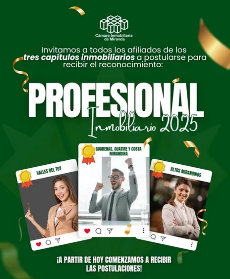 La Cámara Inmobiliaria del Estado Miranda reconoce la labor de sus afiliados, otorgando el reconocimiento al Profesional Inmobiliario del año 2025 en cada uno de sus Capítulos Inmobiliarios: Altos Mirandinos, Valles del Tuy y Guarenas-Guatire-Costa Mirandina.