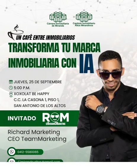 Contaremos con la presencia de Richard Cantillo, richard @richardcmarketing, CEO de Teammarketing @teammarketing.inmuebles con el tema “Transforma tu marca inmobiliaria con IA”